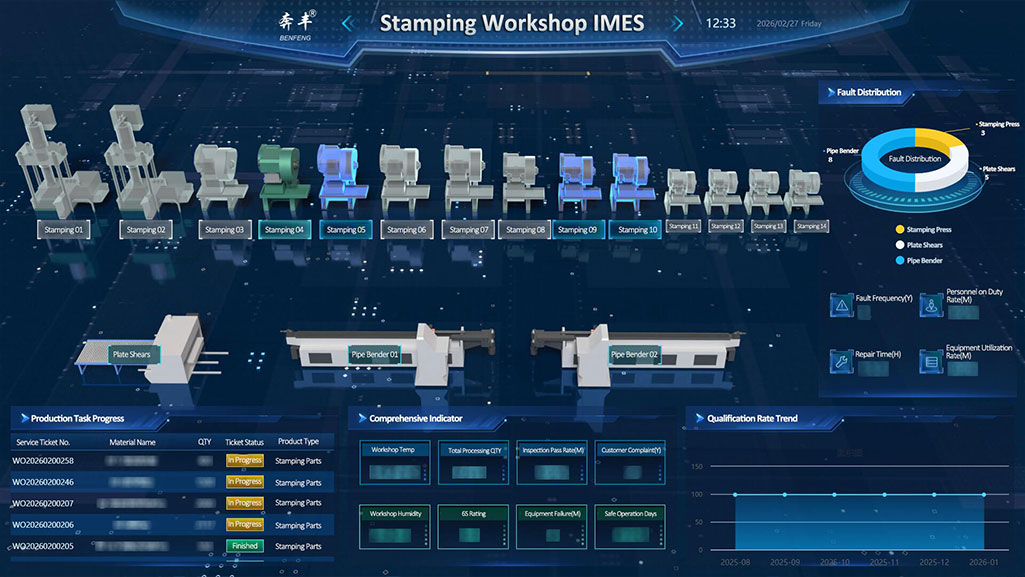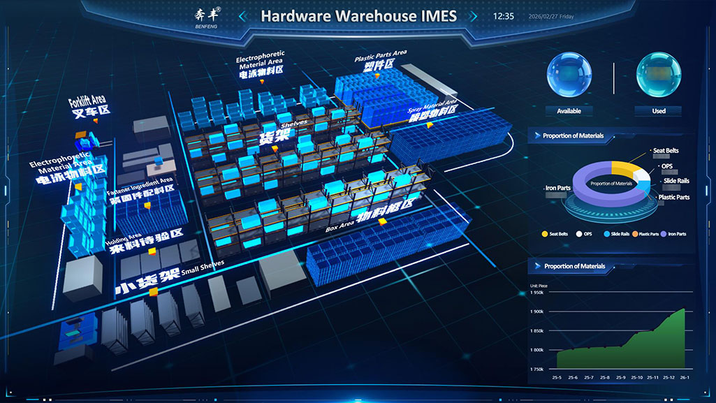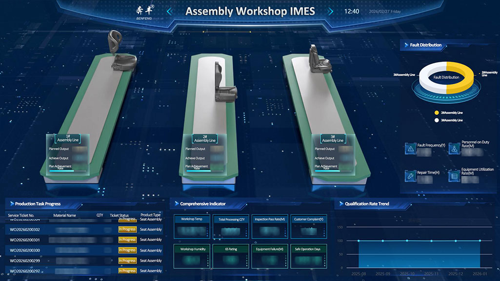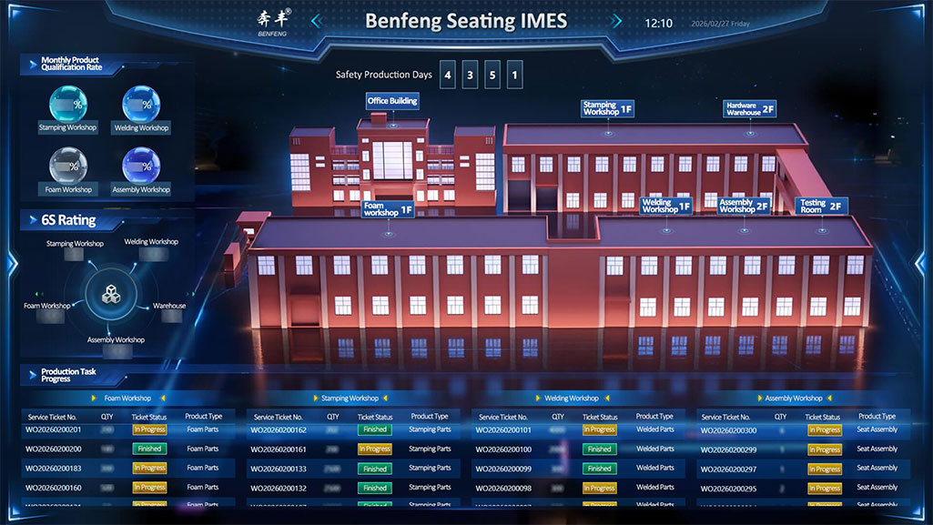 Sa digital ecosystem ng Benfeng Seats IMES, ang assembly workshop, kasama ang matalinong full-process na pamamahala nito, ang naging huling testing ground para sa kalidad ng mga natapos na upuan.