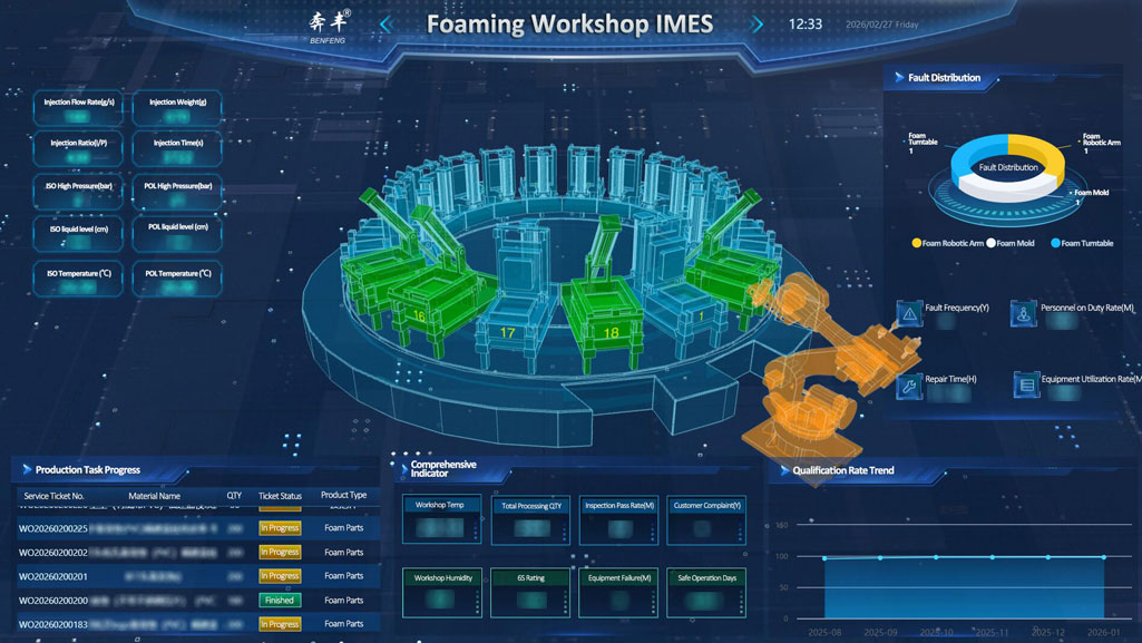 Sa loob ng digital matrix ng Benfeng Seats IMES (Benfeng Seats Intelligent Manufacturing Platform), ang foaming workshop, kasama ang napakatalino nitong production environment, ay naging pangunahing forging ground para sa performance ng kaginhawaan ng upuan.