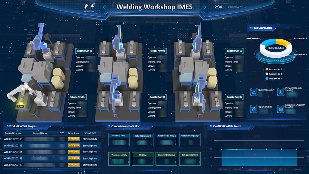 Sa pamamagitan ng 3D visualization technology, malinaw na ipinakita ng workshop ang collaborative operation ng maramihang intelligent welding robotic arms. Ang bawat robotic arm ay nilagyan ng dedikadong operator at parameter monitoring module (boltahe, kasalukuyang, welding count, atbp.), na nakakamit ng isang tumpak at nakokontrol na proseso ng welding. Kasabay nito, sinusubaybayan nito ang mga pangunahing tagapagpahiwatig tulad ng temperatura, halumigmig, at ang bilang ng mga pagpapatakbo ng welding bawat araw sa real time, na tinitiyak ang kalidad ng welding mula sa lahat ng dimensyon, mula sa kapaligiran hanggang sa proseso.